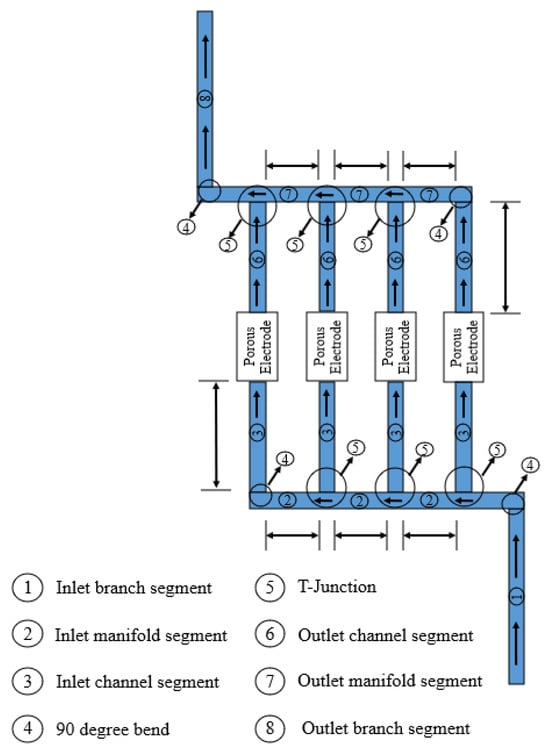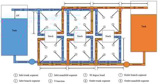 and represent the electrical resistance of the electrolyte flowing through the channels and manifolds associated with cell of stack , while and represent the electrical resistance of the electrolyte flowing through the branches and trunks associated with stack . The superscripts and indicate whether the pipe section is associated with the anode or the cathode and and indicate whether the pipe is an outlet or inlet pipe. The manifolds and trunks have been numbered according to their physical position and not their order of appearance. These resistances are calculated according with the expression in Equation (21).