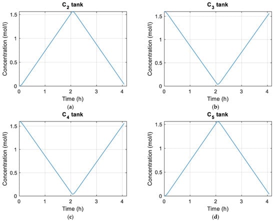 The implementation of this part of the work has been carried out by converting the differential equations to difference equations. Thus, for the tanks, instead of working with Equations (15)–(18), the difference equation defined in Equation (19) is used.