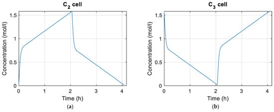 referring to the vanadium species, to the simulation step, and particularizing to the positive and negative tank values as appropriate. The same has been performed with Equations (3)–(6), resulting in Equation (20).