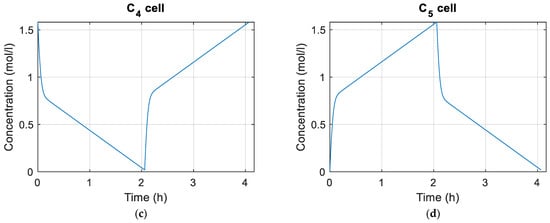 In the case of considering the diffusion of vanadium ions through the cell membranes, other equations related to the side reactions that occur would also have to be taken into account, as described in [22,23]. Taking into account these side reactions would influence the expressions of the mass balance equations of the cells as shown in [20]. For this work, the mass balance equations considered for the VRFB cells are (3)–(6) [22,24].
