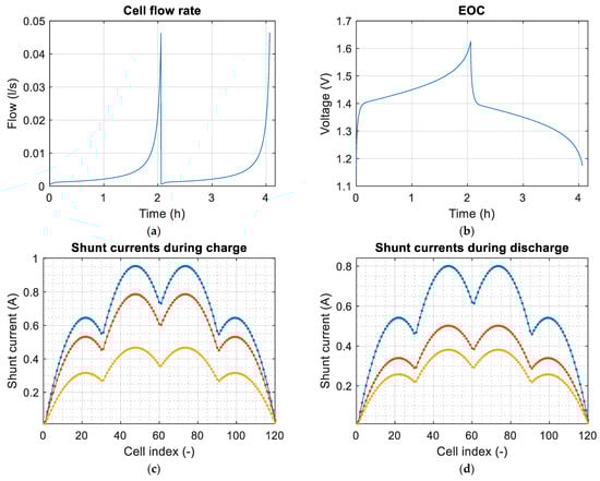 In [17], a study of shunt currents is conducted for a case of a single-stack battery with 10 cells. The calculation of the currents is made by means of a model developed with Kirchoff’s laws, in which it is considered that the currents that circulate through the two positive or negative channels of the cells are the same, making the pertinent simplifications derived from this consideration. This model is verified against a VRFB stack of which details are given on the materials used for its fabrication, showing that the results of the shunt currents obtained with the model are close to the experimental ones. In this article, a sensitivity analysis is also performed, showing results of increases and decreases of shunt currents for changes in model parameters such as equivalent pipe resistances, cell resistances, and total current imposed on the battery. The study of shunt currents is a current topic, as shown in articles such as [18,19].