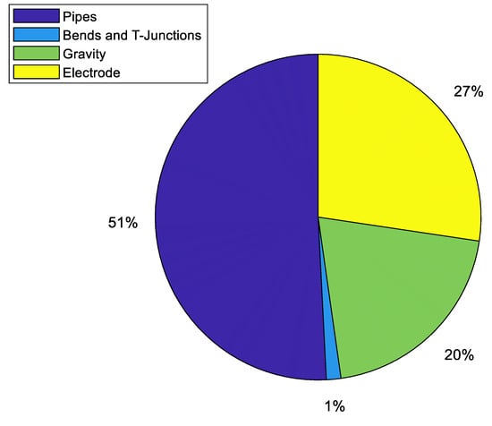 Shunt currents appear in an RFB because the electrolyte flowing through the hydraulic system and connecting the different cells and stacks is electrically conductive. In general, for RFBs, the existence of shunt currents leads to two main problems. On the one hand, as part of the current is lost in the hydraulic system bypasses, the current reaching the cells is less than it should be, causing power losses and consequently lowering the efficiency of the system. On the other hand, the shunt currents, which circulate through the electrolyte, produce the discharge of reactants, which can cause corrosion reactions in the different elements of the battery, such as electrodes and pipes [28,29].