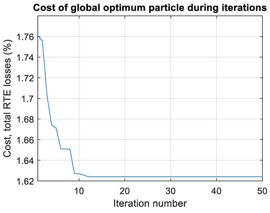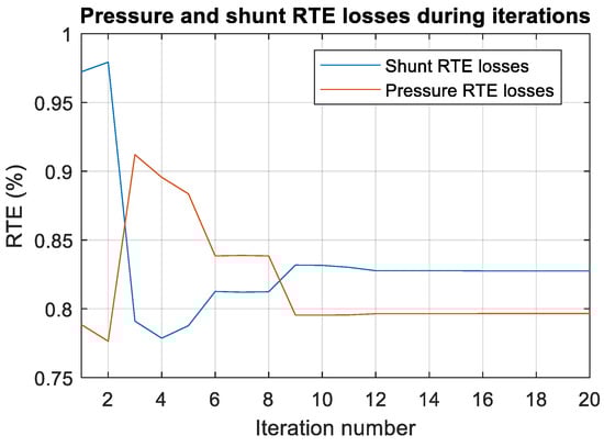 However, it must be taken into account that initially, in the random initialization of the particle population itself, a particle has been obtained whose value of the variables substantially improves the efficiency obtained from the example of Section 5, from having a total of RTE losses of 2.3759% to 1.7608%—this is already very important to take into account. Table 16 shows the evolution of the RTE losses during the algorithm iterations, broken down into shunt and pressure losses.