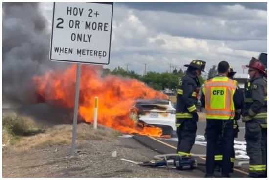 - Nerozzi, T.H.J.; Fox News. California Man’s Tesla Catches Fire While Driving on Highway. 2023. Available online: https://www.foxnews.com/us/mans-tesla-catches-fire-while-driving-on-highway (accessed on 27 May 2024).