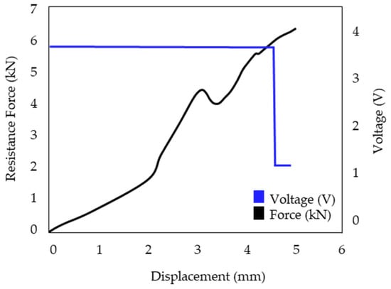 The previous test indicates that the ISC occurs in the top region of the cell, where the jellyroll and shell casing are in contact. The bending of the shell casing punctuates the separator, leading to the appearance of cracks and thinning, which cause the voltage drop because both electrodes get in contact. The test results indicate that the failure occurs at a compression of 4 mm, as a voltage drop due to ISC occurs at this stage. Figure 3 contains the representation of the results from the test in [], which demonstrates that the voltage does not reach 0 V. Therefore, considering the complexity and risks of the residual voltage, specific LIB recycling protocols have been developed to address this issue [].
