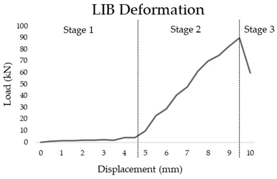 Figure 4, which is generated from [], aims to describe the general tendency of cylinder 18650 cells deformation when compressed at 1 mm/min, 5 mm/min, and 10 mm/min. The physical aspects of the cells are described in Table 3. In the curve data, it can be observed that during initial loading, the displacement of the cell remains constant (stage 1) until it has been fully compressed and all remaining space within it has been consumed. Then, loading increases linearly until the maximum peak of force is reached (stage 2), which is followed by a sudden loading drop due to the breakage of internal components (stage 3). In general, higher loading entails higher displacement of the cell.