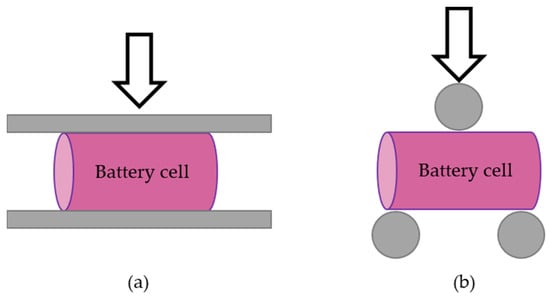 LIBs consist of the stacking and winding of multiple porous-material layers that suffer from deformation when subjected to mechanical loading. The force–displacement response of LIB changes depending on the loading conditions and cell structure that could cause shell compression []. Table 2 aims to summarize the most common compression tests for cylinder and prismatic cells [].