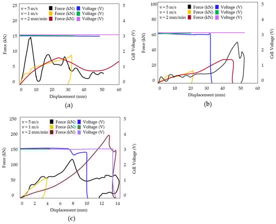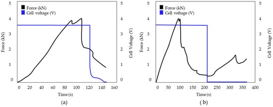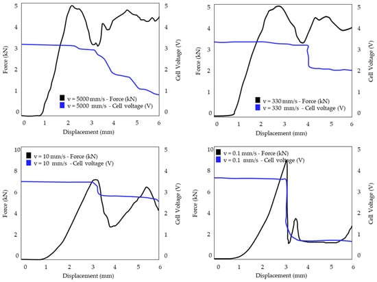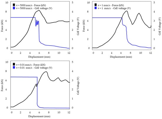 It can also be observed that the voltage of the pouch cells does not decrease to 0 V, meaning that they do not always come to an ISC when subjected to mechanical loading. The load, voltage, and displacement time histories of cell type 1 at different velocities are given in Figure 11, whereas the same results for cell type 2 are represented in Figure 12.