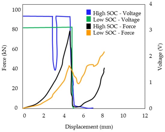 Despite the curves from Figure 6 demonstrating that all tested cells ended with a voltage drop and the initiation of the ISC, the cells loaded at high SOC also experienced an early voltage drop that has been attributed to their stiffness decrease and the increase in electrode swelling. The early voltage drop can also be attributed to electrode contact due to the presence of dendrites. The voltage recovery can be attributed to the presence of leakage, which allowed the dendrites to move backward, reducing the pressure inside the LIB. Therefore, the SOC and deformation rate are strongly related to the LIB stiffness and electrode swelling, and thus cell failure. The energy accumulated in the LIB at higher SOC levels puts the performance of the LIB at risk, making it more susceptible to failure under mechanical loads. Therefore, at early displacements, it could experience voltage drops without causing an ISC. These findings lead to the conclusion that working at low values of SOC increases the mechanical integrity of the cell [,]. The above-mentioned studies also remark on the difficulties of assessing mechanical failure before ISC, as fire and high temperatures damage the components, making it difficult to obtain feasible evidence of degradation. The results also recommend considering the velocity as a variable that has an influence on failure mechanisms.