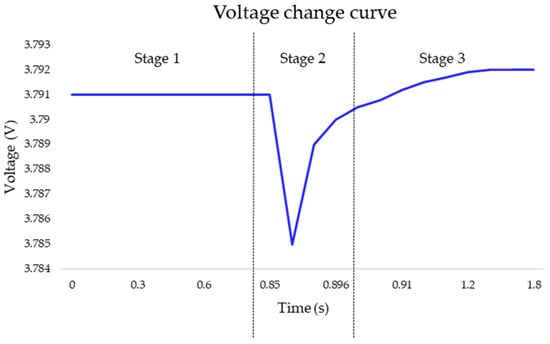 The voltage recovery of the LIB described in Table 4 follows after an impact has been investigated in []. The high-acceleration impact was reproduced by means of a machete hammer that generates an impact pulse on the LIB, which is considered to be hazardous compared to an EV crash. The results of the voltage drop are represented in Figure 8. The voltage drop can be divided into three different stages: during the first one, the voltage experiences a slight drop, followed by a gradual rise, until it finally reaches a level slightly above the one from the previous stages.