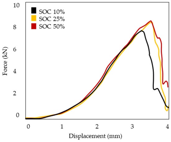 Both tests confirmed that a higher SOC increases cell stiffness due to the insertion of lithium ions in the anode and the deintercalation in the cathode. Even though the cathode stiffness is not affected by SOC changes, the results from the test confirm that the anode expands around 10% when increasing the SOC from 0 to 30%. Consequently, the overall compression increases by 20% for the above-mentioned SOC increase. The impact of the SOC on the voltage curve when the ISC occurs shows the following differences: on the one hand, the voltage at a low SOC drops immediately, whereas at a high SOC, the voltage drops progressively. This effect can be attributed to electron depletion, which is faster at low SOC. The results from the three-point bending test variant are represented in Figure 6 [].