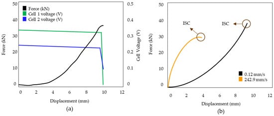 (a) Voltage drop due to cell failure and (b) Change in force–displacement as a function of deformation rate.