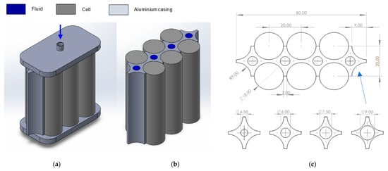 Typical linear liquid cooling structures contain a coolant domain located above and below the cells with one inlet and one outlet, as shown in Figure 1a. Both this model and a simplified version, as shown in Figure 1b, were tested with a set inlet velocity and cell heat generation. The results revealed only a minimal temperature difference of 0.02 K between the two designs. Therefore, the simplified version was adopted as it significantly reduced model complexity and simulation time. The four-point star-shaped structure, which is 65 mm in height, interlocks the cylindrical cell surfaces, as illustrated in the top view drawing in Figure 1c. This figure also depicts the variation in channel diameters, which will be evaluated in the simulations. Additionally, the inlet flow velocity will be tested at 0.01 ms−1, 0.05 ms−1, 0.1 ms−1, 0.5 ms−1, and 1 ms−1. These parameters were selected to explore untested variations in the cooling design and to validate against the existing literature.