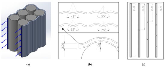 The second model created is illustrated in Figure 2a. Figure 2b shows the top view of the pack, depicting the cooling plate thickness and channel angles of 45 °, 55 °, 65 °, and 75° selected for the investigation. Then, 1, 2, 3, and 5 coolant channels will be examined, with the width of these channels remaining constant. The varying height dimensions of the coolant domain are illustrated in a front view in Figure 2c.