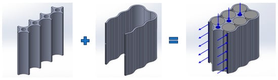 Illustrated in Figure 3 is the OD, the third and final cooling structure. This figure also depicts the design methodology of the OD which combines components from both the HFD and VFD. The OD incorporates an outer wavy channel and a star-shaped configuration into a single design. Two horizontal channels with an angle of 65° were used, determined through testing of the thermal efficiency based on simulations of the VFD and HFD.