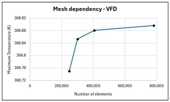 Once the CAD model’s geometries were created, they were imported into Ansys 2024 R1, and a tetrahedral-shaped mesh was selected due to its ease of generation in complex geometry cases. A mesh refinement study was conducted on the VFD to determine the optimal mesh density, using the maximum temperature as a basis to ensure accurate solutions. The results are presented in Figure 4 and show that the maximum temperature converges when more than 400,000 elements are produced. The final mesh utilises a 1 mm element size, producing 781,479 elements. As this mesh size produced satisfactory convergence, it was applied to the other designs as they share similar geometry. This mesh was further refined using inflation layers over walls, flow channels, and cells where heat transfer and thermal gradients are expected. The total number of mesh elements for each design and parameter change was maintained at a similar range where possible. Specifically, 781,479 elements were produced for the VFD, and 712,904 elements were produced for the HFD, as shown in Figure 5a,b, respectively.