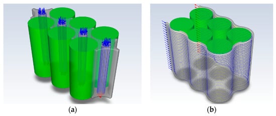 A heat generation rate of 138,000 Wm−3 was applied to each cell, highlighted in green in Figure 6, to replicate heat generation in a cell undergoing a 5C charge/discharge rate. The temperature of the coolant at the inlet was set to 300 K, and the velocities were adjusted accordingly to the project aims. The inlet location and coolant path of both designs are depicted in Figure 6 by the blue arrows and blue lines.