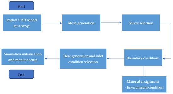 The timestep was set to 1 s for boosted accuracy, with a maximum number of iterations per time step set to 400 to increase the chances of convergence. Although, the maximum number of iterations it took for the time step to converge was 20. Following the completion of each design and variable change in the investigation, the boundary conditions, solution activities, and monitors to record and plot the maximum and minimum temperatures for the cell volume were all transferred to the subsequent stages. The simplified CFD configuration process can be summarised by the flow chart from Figure 7.