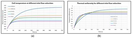 The first parameter optimisation study explored the impact of inlet velocity on the maximum temperature (Tmax) and temperature difference between the maximum and minimum (∆T) of the battery pack. For this study, 6 mm channels were used. Figure 8a presents the results for the effect of the five different velocity values on the Tmax of the cell. A clear trend is illustrated where increasing the velocity reduces the Tmax of the cells. This trend aligns with heat flow Equations (8) and (9), where the rate of heat flow is directly proportional to the mass flow rate and hence the velocity. Initially, the temperature rises rapidly for all velocities within the first 60 s of cell discharge, after which the temperatures begin to diverge. Beyond 320 s, the Tmax of the cell is reached and levels out for all velocities except for 0.01 ms−1. Table 2 provides the maximum temperature and uniformity achieved by the cell after 720 s for different velocities. Comparing the results reveals that the difference in final maximum temperatures between 0.5 ms−1 and 1 ms−1 is only 0.327 K, while the difference between 0.1 ms−1 and 0.5 ms−1 is 1.308 K, indicating the diminishing effectiveness of higher flow rates beyond 0.5 ms−1. This study can be validated against the work of Lloyd et al. [17], where their LCD of a six-cell lithium-ion battery pack with dimensions, material, and shape produced a Tmax of 309.308 K, which is 0.029% different to the Tmax from the work of this cooling structure.