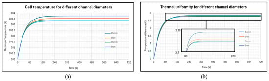 The thermal uniformity for different diameters is shown in Figure 9b. While initial observations suggest a negligible difference between the variables, a closer examination within a time of 80–720 s and a ∆T of 2.7–2.86 reveals some variation. The 9 mm diameter exhibited a lower ∆T compared to the 4.5 mm at 720 s, but this was marginal; for the 4.5 mm channel, it was 2.840 K, and the 9 mm channel was 2.767 K, showing a difference of 0.0073 K. Although the channel diameter shows improvement in thermal uniformity, the impacts are minimal when compared to changing the velocity.