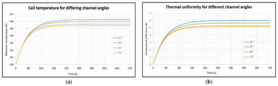 Effects of channel angle on (a) maximum cell temperature and (b) cell temperature difference.