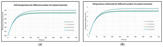 The graphs in Figure 11 present the results on how Tmax and ∆T of the cell vary when one, two, three, and five coolant plate channels are present in the HFD. As seen in the first 80 s, both Tmax and ∆T increase sharply, before diverging. Increasing the number of cooling channels leads to a decrease in the final Tmax and ∆T within the battery pack. However, beyond one channel, the influence becomes minimal, as indicated by Table 5, which shows a Tmax difference of 0.544 K between one and two channels, while the difference between Tmax of channels two and five is only 0.121 K. In addition, the temperature uniformity showed a similar relationship as the number of channels increased.