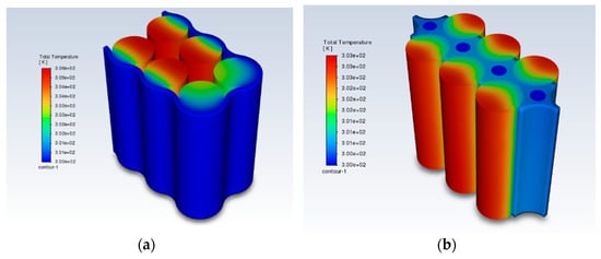 Battery pack temperature contour after 720 s at 0.5 ms−1 inlet velocity: (a) HFD; (b) VFD.