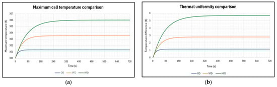 VFD, HFD, and OD thermal comparison: (a) maximum cell temperature; (b) cell temperature difference.