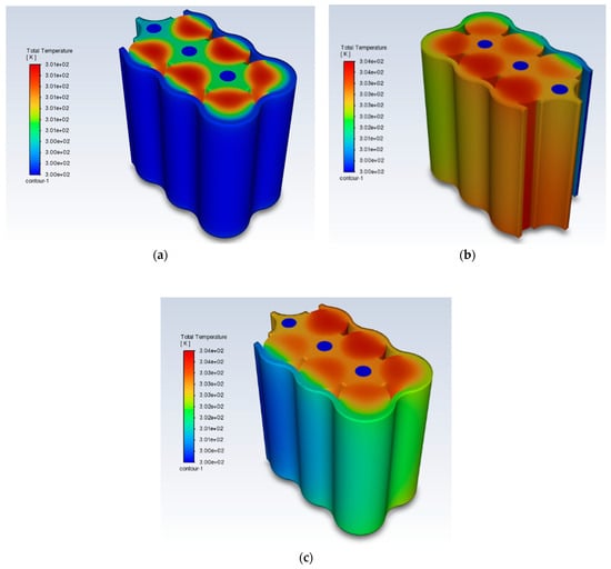 The final optimal design (OD) for the six-cell 18,650 battery pack combines the VFD and HFD, featuring three vertical 6 mm diameter channels and two 31.75 mm × 1 mm horizontal channels for coolant flow, as shown in Figure 3. The thermal performances of the VFD, HFD, and OD are plotted in Figure 13, with the final Tmax and ∆T values presented in Table 6. The OD design excelled in the thermal management of the pack compared to the other designs, efficiently dissipating the heat generated by the cells after 50 s and maintaining Tmax at an extremely low temperature of 301.311 K for the remaining time steps. In contrast, the VFD took 160 s to reach a Tmax of 303.534 K, while the HFD showed the poorest cooling performance, reaching a Tmax of 306.018 K after 320 s. The superior performance of the OD is attributed to its greater contact surface area with the cells compared to the other designs; the cells are almost entirely encapsulated, whereas the HFD and VFD leave 50% of the cells without contact. The temperature contour of the OD is illustrated in Figure 14a. Furthermore, as explained by Equation (9), more heat generated by the battery can be transferred to the cooling structure and expelled from the system. All three designs comfortably met the 298 K < Tmax < 313 K requirement, with only the OD and VFD satisfying the ∆T < 5 K requirement.