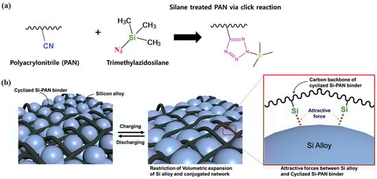 The appealing characteristics of PAN make it a suitable choice for use in negative electrodes, such as those made from graphite, silicon, and lithium titanate (Li4Ti5O12, LTO) [73]. Umirov et al. developed a new anode binder, silane-incorporated cyclized PAN (Si-PAN), using a simple azide–nitrile click reaction. The chemistry behind the reaction and the volumetric expansion of the Si alloy in the Si-PAN binder are shown in Figure 2. Based on the amount of silane in PAN, the study assessed the CE and capacity retention of each electrode cured at 300 °C. Among the silane-treated PAN samples, the Si-PAN-2.0 electrode exhibited the highest capacity retention of approximately 60% after 30 cycles [79].