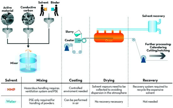 A simplified schematic representation of the production process for batteries. The primary benefits of using water instead of NMP are outlined for each stage, starting from the left and going rightward: the initial mixing of slurry, coating on the current collector, drying of the electrode layer, and solvent recovery. With permission from [82].