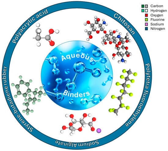Binders are essential for improving battery capacity because they affect the surface chemistry of electrodes. The solid electrolyte interface (SEI) and passivation layers formed on the surface of anode materials are influenced by binders [28]. Hence, understanding the chemistry of binders is crucial to developing high-energy-density batteries. Depending on the solubility of the binders in the solvents, they can be classified as aqueous or non-aqueous binders [20,48]. The following subsection discusses in detail some of the commonly used aqueous and non-aqueous binders.