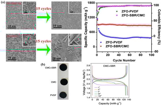 (a) SEM images of ZFO-SBR/CMC and ZFO-PVDF binder. Cyclic performance of the same binder electrode assembly [96]. (b) Photos of NTP electrode slurries made with each of the three different binder mixtures and Galvanostatic charge–discharge curves and cycling stability tests for the NaTi2(PO4)3 electrode slurries acquired at 0.2 C rate (capacity at 1 C = 133 mAhg−1) over 500 cycles using CMC + SBR system [101]. Reproduced with permission.