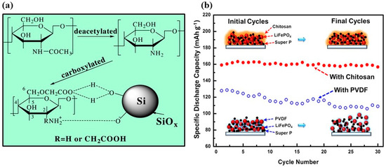 One study explored the biopolymer chitosan as a promising binder for producing LFP cathodes in LIBs as demonstrated in Figure 7b. Utilizing chitosan as a binder resulted in an electrode with a high discharge capacity of 159.4 mAhg−1, along with an outstanding capacity retention ratio of 98.38% [122]. Several properties dictate the use of chitosan as a binder. The degree of acetylation (DA), which is the percentage of monomeric acetylated units, and the degree of polymerization (DP), which is the number of monomer units in a biopolymer, are crucial parameters that dictate the chemical and physical properties of chitin and chitosan [123]. Chitosan also has applications in Si anodes; its proposed mechanism is depicted in Figure 7a. Hamzelui et al. evaluated chitosan samples with various DAs and DPs as binders for Si/Gr-based anodes. Electrochemical measurements conducted in Si/Gr||Li metal and NMC622||Si/Gr full cells led to the selection of a chitosan binder with a high DP of 1618 and a DA of 50% (DA50) as the optimized version for evaluating Si/Gr anodes in battery cells [117].