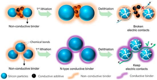 Demonstration of the effectiveness of conductive binders in securely binding Si particles together, compared with non-conductive binders. Reproduced with permission from [144].