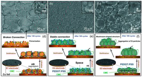 SEM images of different samples with various content of acetylene black (AB) and PEDOT:PSS after 100 cycles. (a,d) contain 20% AB and 0% PEDOT:PSS, respectively, (b,e) contain 10% AB and 10% PEDOT:PSS, respectively, and (c,f) contain 0% AB and 20% PEDOT:PSS, respectively (d–f) represents schematic illustrations of lithiation/dilithiation of the same samples. PEDOT:PSS improves the binding of Si particles compared with cells without the PEDOT:PSS binder. With permission from [154].