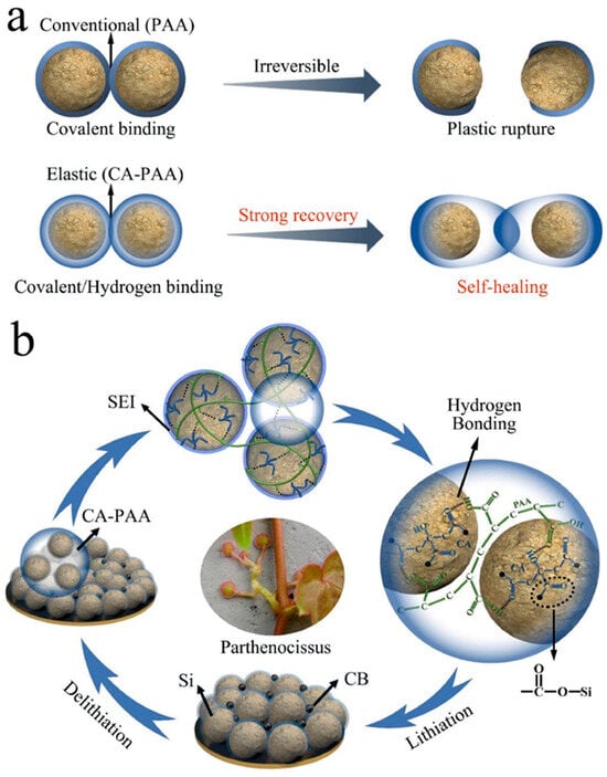 Nature has inspired the development of self-healing binders. Drawing inspiration from Parthenocissus plants, Wang et al. created a citric acid (CA)-PAA binder for silicon anodes. This binder forms multiple hydrogen bonds through the in situ cross-linking of water-soluble CA and PAA, establishing a reversible network for silicon particles, as illustrated in Figure 10 [179].