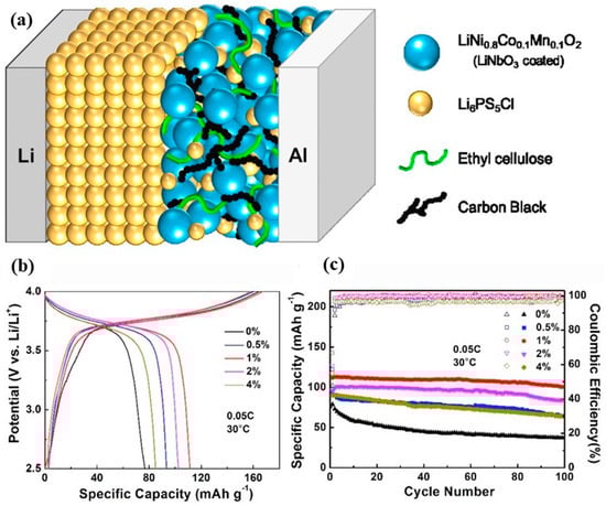 The exploration of binders in ASSBs utilizing sulfide electrolytes has been limited because the sulfide electrolyte itself can serve as a binder in the composite electrolyte [185]. Owing to the strong reactivity of sulfide materials to organic solvents, the choice of solvent for wet processing is restricted to nonpolar and weakly polar solvents, such as methyl alcohol, toluene, and xylene [196,197,198,199,200]. Consequently, the availability of polymeric binders, including materials, such as SBR, nitrile–butadiene rubber (NBR), and ethyl cellulose, is highly constrained [185,196,197,200]. Rosero–Navarro et al. presented the first investigation into the effect of binder content on the electrochemical performance of all-solid-state lithium batteries employing a composite cathode with a high active material content (LiNi1/3Mn1/3Co1/3O2, 89 wt%) covered with a solution-derived solid electrolyte. The use of ethyl cellulose as a binder effectively enhanced the cycle life of this ASSB. A higher capacity retention rate was achieved with the addition of a small amount of binder with 0.5 wt% ethyl cellulose, resulting in a capacity retention rate of 91.7% after ten cycles [185]. Another study investigated varying contents of ethyl cellulose as a binder in a composite electrode system comprising the high-nickel material LiNi0.8Co0.1Mn0.1O2 (NCM) as the cathode active material and Li6PS5Cl as the solid electrolyte, as shown in Figure 11. Compared to electrodes with no binder, those with 0.5, 1, 2, and 4 wt% binder content exhibited initial discharge capacities of 94.6, 111.7, 95.8, and 89.9 mAhg−1, respectively. Additionally, the initial CE of the electrodes with 1 wt% binder reached 66.8%, indicating that the binder effectively reduced the initial irreversible capacity. Consequently, 1 wt% ethyl cellulose served as the best binder for the NCM electrode [188].