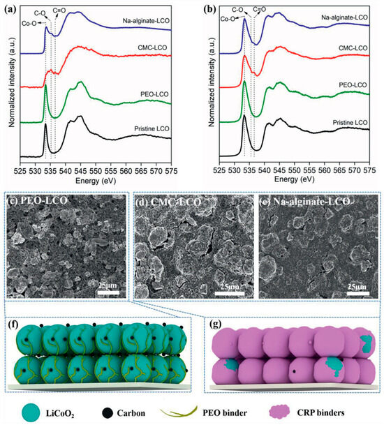 O K-edge X-ray absorption spectroscopy (XAS) in (a) total electron yield (TEY) mode and (b) fluorescence yield (FLY) mode for different LCO samples. SEM images for (c) PEO-LCO, (d) CMC-LCO, and (e) Na-alginate-LCO electrodes. Schematic diagrams for the binding capability and mechanism of (f) PEO and (g) CRP binders. PEO shows better binding capability than CRP binders. With permission from [210].