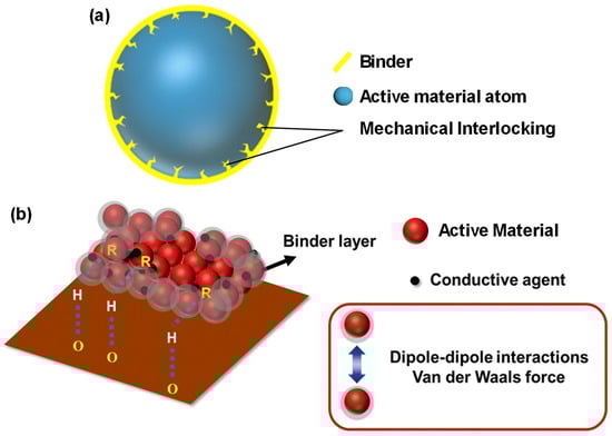 Binders are made of polymeric materials and account for approximately 5 wt% of the total battery weight [28]. Generally, they are electrochemically inactive. They serve multiple functions: (1) providing stability to the battery; (2) ensuring homogeneous coating and adhesion of the active materials to the current collector; (3) providing an electrochemical window that prevents chemical reactions between the binders and electrodes; and (4) allowing electron and ion movement [29,30,31]. Binders are crucial for the electrode fabrication process because they are mixed with the electrode material to form a paste. This paste is subsequently coated onto the collector using the doctor blade technique and then dried [20,31]. Throughout the lithiation and delithiation processes, the volume changes in the electrode can damage its mechanical structure. Therefore, the binder used for electrode fabrication must possess sufficient mechanical properties, such as strength, elasticity, flexibility, and hardness, to maintain the integrity of the electrode [27]. Furthermore, the lowest unoccupied molecular orbital (LUMO) of the binder used in the anode should be positioned higher than the chemical potential of the active material. Alternatively, the highest occupied molecular orbital (HOMO) of the binder should be lower than the chemical potential of the cathode [27].