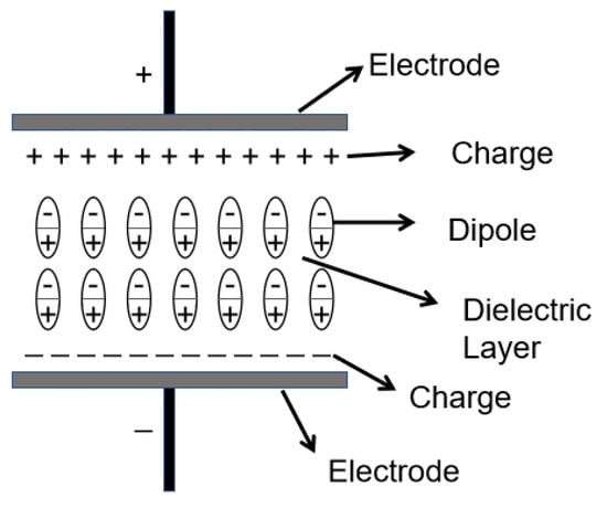 The energy storage mechanism of a dielectric relies on its polarization process triggered by an electric field [24]. When an electric field is applied, the dielectric becomes polarized, leading to the accumulation of equal amounts of positive and negative charges on its surface. Consequently, energy is stored within the dielectric in the form of an electric field, as shown in Figure 2. The mechanism behind energy storage and release in dielectrics is elucidated through the electric displacement (D)-electric field (E) loop. As an electric field is applied, dielectrics become polarized due to the relative displacement of oppositely charged particles within their dipoles. Conversely, upon the removal of the electric field, depolarization occurs, causing the oppositely charged centers to tend toward overlap [25].