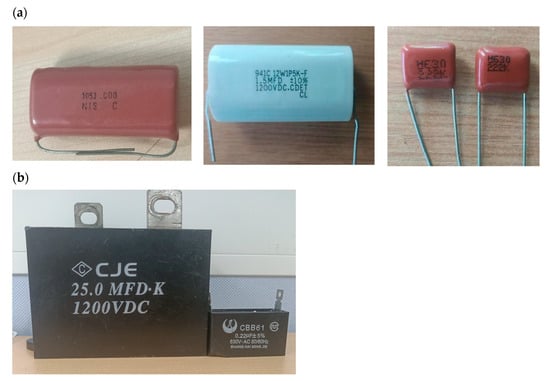 The digital images of film capacitors. (a) Wound-type film capacitors. (b) Stacked-type film capacitors. The capacitor on the left is used for DC circuits, while the one on the right is used for AC circuits.