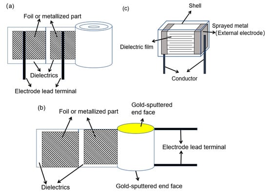 Film capacitors can be classified based on their structure, type of dielectric, and electrode formation method. To begin with, film capacitors are produced either in the form of winding utilizing a capacitor winding machine or as stacks of dielectric films [28]. These two distinct manufacturing methods are commonly referred to as coil technology and the stacking technique, respectively [29,30]. Therefore, based on their structure, film capacitors can be broadly classified into two types: “wound type” and “stacked type”. The digital images are shown in Figure 3. The wound type involves winding and stamping polymer films and then inserting them into a shell. This type can further be divided into two winding methods: inductive (Figure 4a) and non-inductive (Figure 4b). The stacked type, on the other hand, involves stacking multiple layers of polymer films together and then inserting the stacked body into a shell (Figure 4c). Currently, wound-type film capacitors are more commonly used due to their ease of manufacturing.