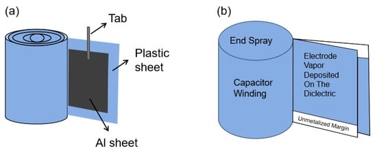 In comparison to inorganic dielectric capacitors, organic dielectric capacitors primarily utilize polymer materials as dielectrics, benefiting from the abundance of raw materials available. Additionally, the thickness of the films can be made exceptionally thin. Nevertheless, organic media are susceptible to aging and exhibit limited heat resistance, potentially compromising the capacitors’ performance [39,40]. The characteristics of film capacitors vary significantly depending on the type of dielectric medium used, resulting in diverse application fields. Organic dielectric capacitors can be classified into two electrode types: metal foil electrodes (the foils are typically on the order of 6 μm in thickness) and metalized electrodes (the metalized layers are <100 nm thick) [41]. The organic dielectric capacitor of a metal foil electrode is made of two layers of plastic film or sheet. Each layer is interspersed with thin aluminum metal foil or sheet, serving as the electrode. Subsequently, the plastic sheets and aluminum sheets are rolled into a cylindrical jelly roll structure. To establish electrical connections, wire leads are attached to both ends of the aluminum sheets, typically through soldering or metal spraying techniques. The thickness of the plastic film determines the separation distance within the capacitor, while the operating area is dictated by the size of the electrodes. In metalized film organic dielectric capacitors, the aluminum sheets or foils are superseded by metal layers that are vacuum-deposited onto the thin film layer. These metal layers possess a thickness of approximately 1/100 of that of the metal foil, making them significantly thinner and more conducive to space conservation [31]. The most frequently utilized metal layer is composed of ultra-thin aluminum. The dielectric is typically formed by a plastic film layer made of synthetic materials, while the electrode is comprised of an aluminum layer [42]. The schematic diagram of the structure of organic dielectric capacitors is shown in Figure 6.