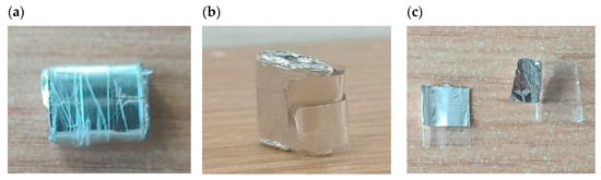 (a,b) Overall structural diagram of a disassembled foil-type film capacitor. (c) The aluminum foil is sandwiched between the plastic films.