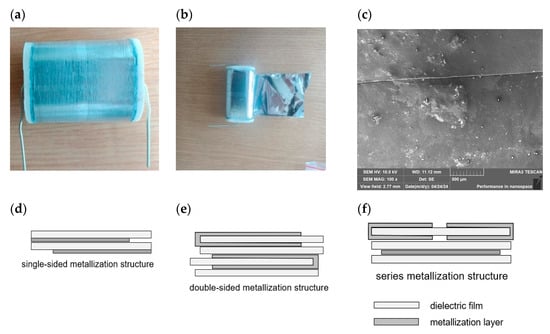 (a,b) Disassembled metalized film capacitor. (c) Placing the dismantled metalized film under a scanning electron microscope (SEM) reveals the deposition of aluminum on the film. (d) Single-sided metallization structure. (e) Double-sided metallization structure. (f) Series metallization structure.