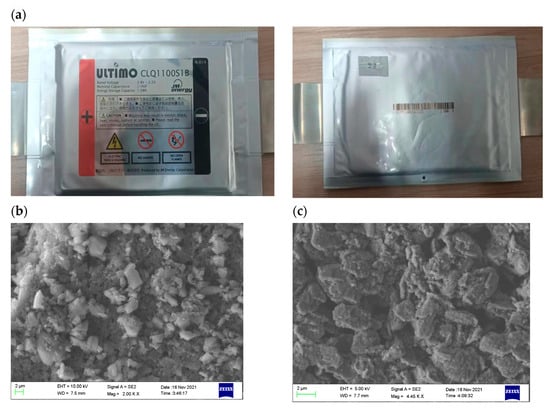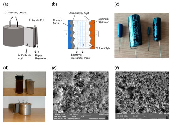 In aluminum electrolytic capacitors, both the anode and cathode consist of pure aluminum foil. The anode foil is coated with a thin layer of aluminum oxide, electrically insulating in nature, serving as the dielectric. This oxide coating, along with the cathodes, is separated by electrolytic paper soaked in an electrolyte solution. This paper, possessing high porosity, can absorb and hold the maximum amount of electrolyte. While the cathode aluminum foil also possesses a naturally formed, very thin insulating oxide layer due to exposure to air, its thickness is significantly thinner compared with the oxide layer on the anode foil [52]. The electrolyte serves as the actual cathode of the capacitor when compared to the anode foil, while the cathode foil merely collects current from the electrolyte [48]. Figure 9c shows digital images of aluminum electrolytic capacitors, and the disassembled structure of one of the aluminum electrolytic capacitors is depicted in Figure 9d. After soaking the anode and cathode aluminum foils of the disassembled aluminum electrolytic capacitor in ionized water and allowing them to dry, they were observed under a scanning electron microscope. It can be observed that the anode aluminum foil is coated with aluminum oxide (as shown in Figure 9e), while the cathode aluminum foil is etched aluminum foil (as shown in Figure 9f).