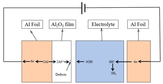 AEC is a type of polarized capacitor that can only be subjected to a DC bias in one direction. Its electrochemical structure is shown in Figure 10 [48]. The dissociation of water molecules in the electrolyte produces proton (H+) and hydroxyl (OH−) ions, which can freely exist in the electrolyte. When a positive electric field is applied to the AEC terminal, staying within the rated voltage, the OH− ions are drawn toward the aluminum anode foil. However, they encounter a dense dielectric barrier that prevents their passage. Conversely, if the applied negative voltage surpasses the potential hurdle posed by the aluminum oxide formed during passivation, the H+ ions are drawn toward the anode foil. Given their significantly smaller size compared with OH− ions, the H+ ions can effortlessly penetrate the dielectric and arrive at the anode, resulting in the production of hydrogen gas. Meanwhile, the OH− ions migrate toward the cathode and unite with aluminum (Al3+) ions, leading to the formation of aluminum oxide on the cathode foil. In this case, the cathode capacitance will decrease, thereby reducing the total capacitance. If voltage is applied for a long time, it will damage the capacitor, so the polarity of ACE cannot be reversed.