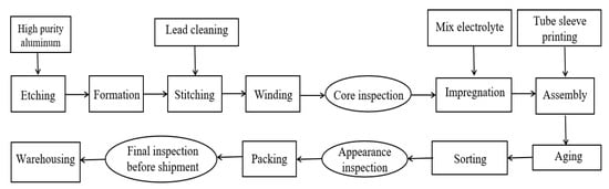 The manufacturing process of aluminum electrolytic capacitors primarily comprises the following steps, as depicted in Figure 11 [50,54]: