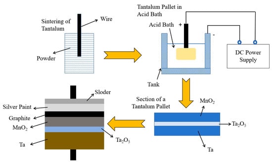 The production of solid tantalum electrolytic capacitors mainly involves the following steps (Figure 13) [31,59,60]: